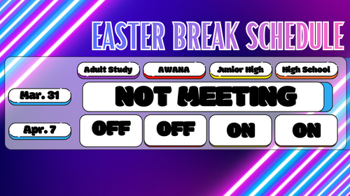 - Night4All Ministries (Adult Study, AWANA, JH & HS) are NOT meeting on March 31st for Easter Break.